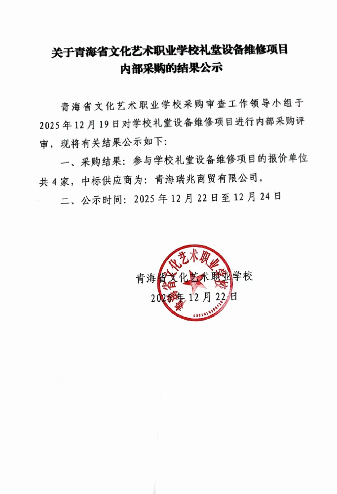 青海省文化艺术职业学校关于礼堂设备维修项目内部采购公告各潜在供应商:青海省文化艺术职业学校拟对礼堂设备修项目进行采购,兹邀请符合本次采购要求的供应商参加报价···
